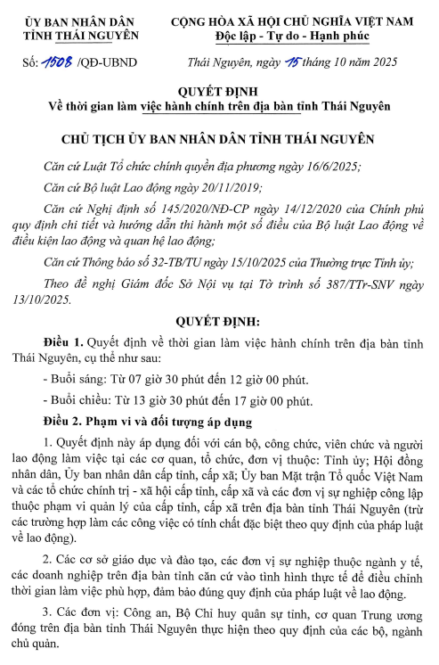 Thông báo về thời gian làm việc hành chính trên địa bàn tỉnh Thái Nguyên