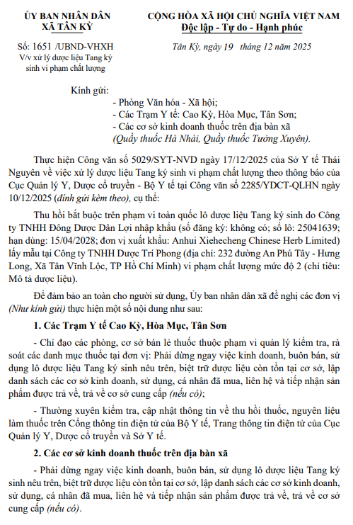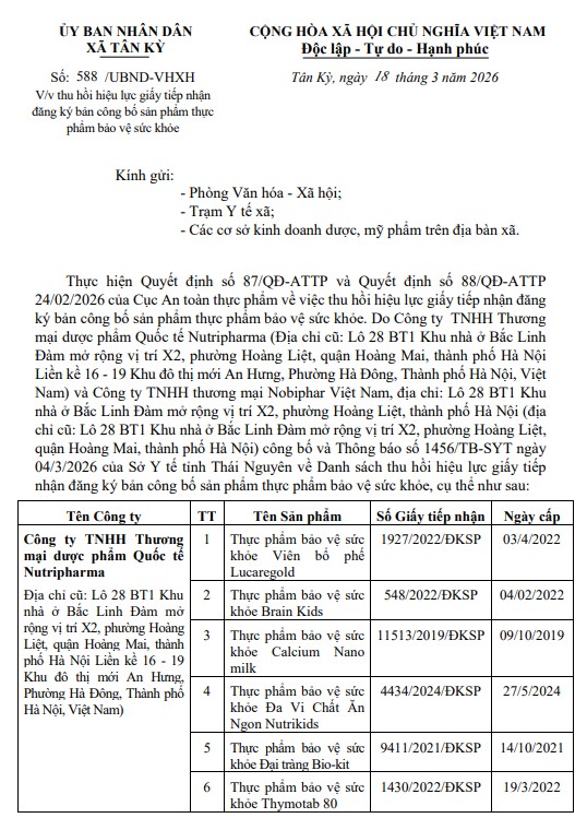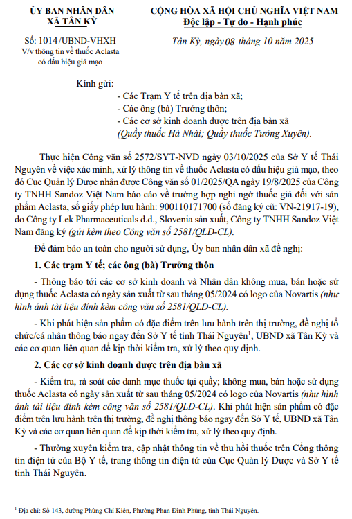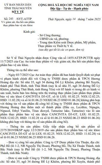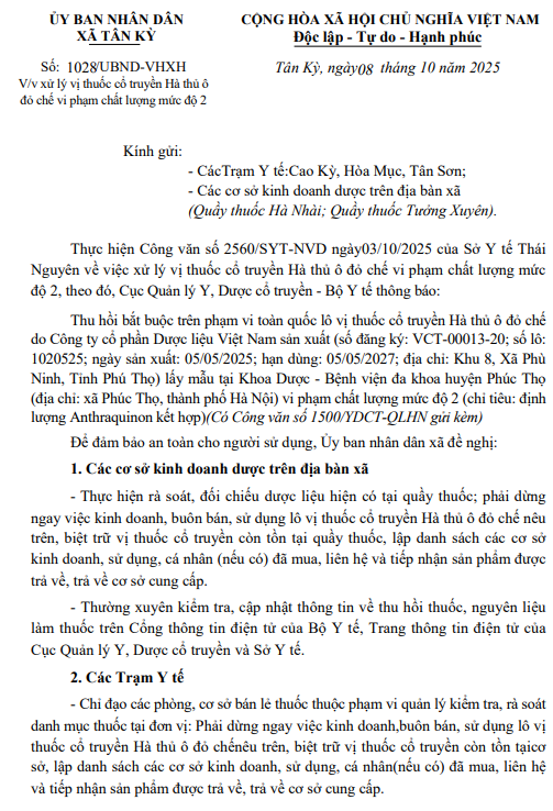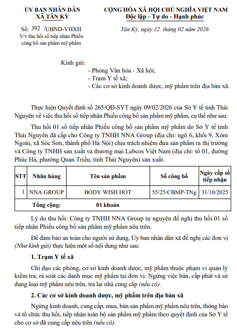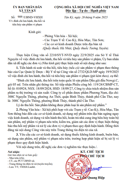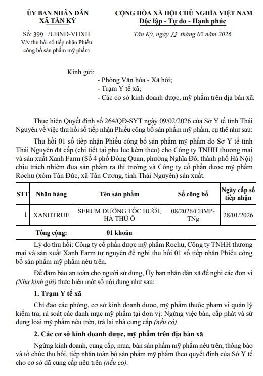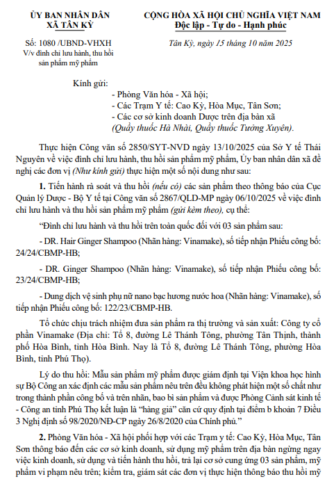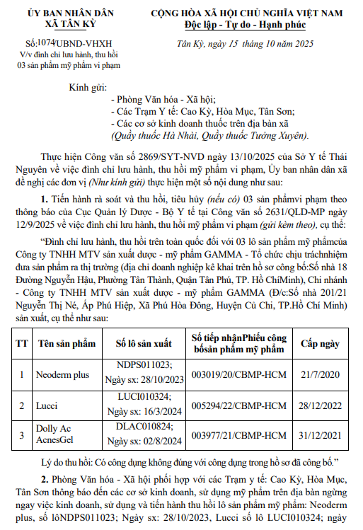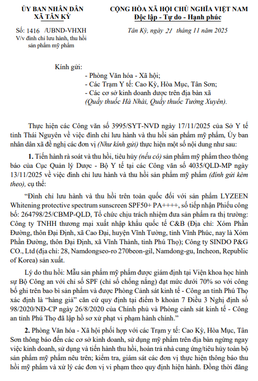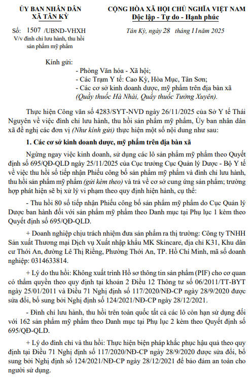 Thực hiện văn bản số 441/SYT-NVY ngày 21/7/2025 về việc thu hồi, tiêu hủy sản phẩm không rõ nguồn gốc, không đạt tiêu chuẩn chất lượng; Văn bản số 515/SYT-NVY ngày 3/7/2025 về việc đình chỉ lưu hành, thu hồi và tiêu huỷ mỹ phẩm vi phạm; Văn bản số 511/SYT-NVY ngày 23/7/2025 về việc đình chỉ lưu hành, thu hồi mỹ phẩm lưu thông có nhãn không đáp ứng quy định của Sở Y tế tỉnh Thái Nguyên. Ủy ban nhân dân xã thông báo các sản phẩm bị cơ quan chức năng đình chỉ, thu hồi như sau: