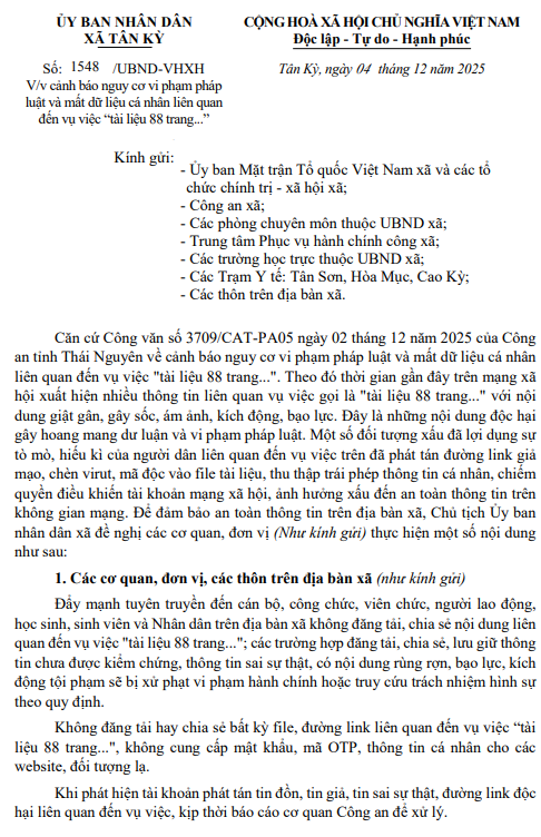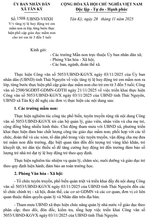 Thực hiện Văn bản số 481/PC07-D8, ngày 06 tháng 8 năm 2025 của Công an tỉnh Thái Nguyên về việc thông báo thời gian bồi dưỡng nghiệp vụ phòng cháy chữa cháy (PCCC), cứu nạn cứu hộ (CNCH) cho các cơ sở giáo dục trên địa bàn xã Tân Kỳ, tỉnh Thái Nguyên.