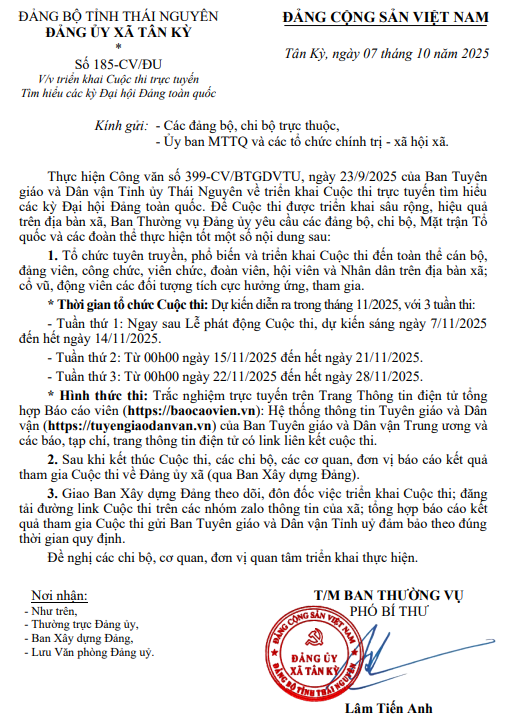 Thực hiện Quyết định số 265/QĐ-UBND ngày 21/8/2025 của UBND xã Tân Kỳ về việc thành lập các đoàn kiểm tra công tác chuẩn bị cho năm học mới 2025–2026; UBND xã thành lập 02 đoàn kiểm tra với thành phần gồm lãnh đạo UBND xã, lãnh đạo và chuyên viên Phòng Văn hóa – Xã hội, Phòng Kinh tế. Các đoàn có nhiệm vụ kiểm tra toàn diện các nội dung, điều kiện phục vụ năm học mới và công tác tổ chức Lễ Khai giảng năm học 2025–2026.
