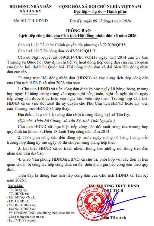 Thông báo lịch tiếp công dân của Chủ tịch HĐND xã Tân Kỳ năm 2026