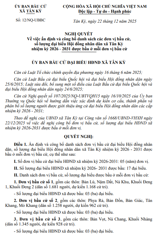 Nghị quyết về việc ấn định và công bố danh sách các đơn vị bầu cử, số lượng đại biểu Hội đồng nhân dân xã Tân Kỳ nhiệm kỳ 2026 - 2031 được bầu ở mỗi đơn vị bầu cử